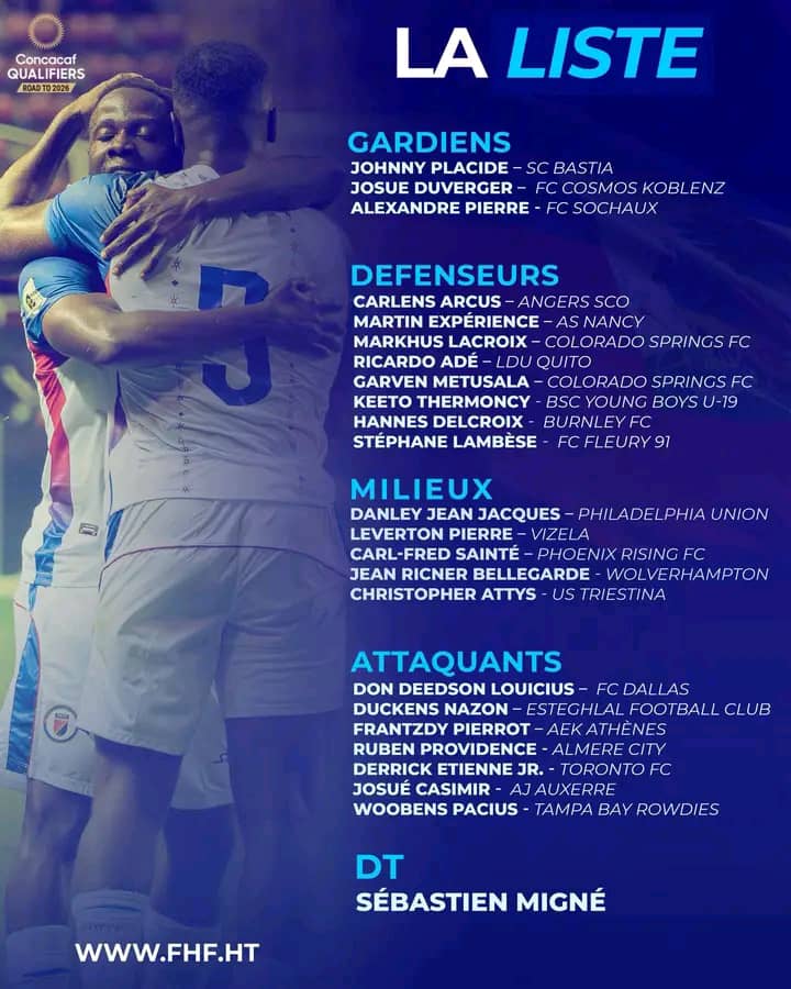 À quelques jours de l’ultime échéance des éliminatoires de la Coupe du Monde 2026, la Fédération Haïtienne de Football a communiqué, ce samedi, la liste des joueurs convoqués par le sélectionneur national, Sébastien Migné, pour le rassemblement du mois de novembre. Après une victoire (3-0) contre le Nicaragua et une défaite sur le même score […]